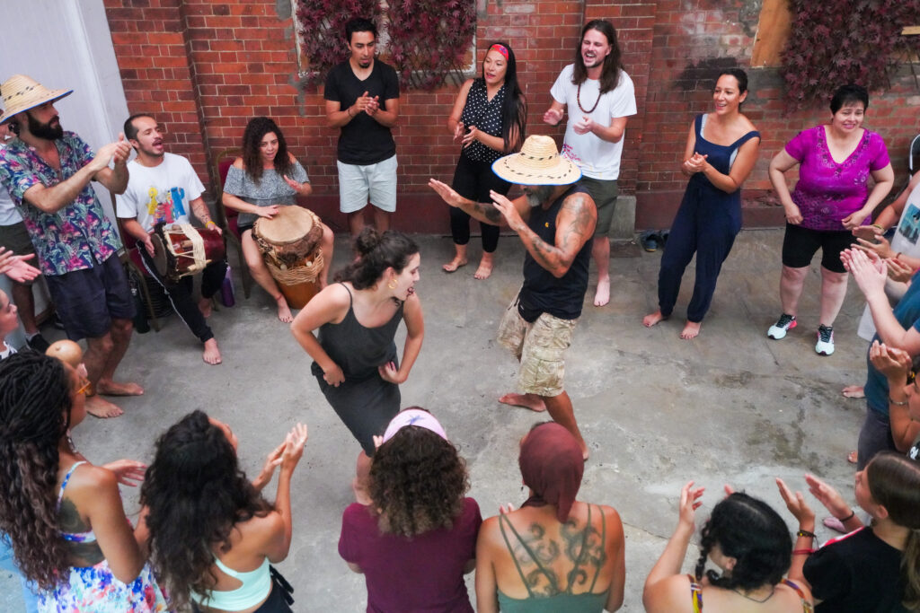 Bullerengue is traditionally shared in a rueda (circle), where drums, voices and bodies respond to one another. Rather than learning choreography, you will be guided to listen, move and express yourself freely. Through call-and-response singing, rhythm and simple steps, participants build a collective energy where everyone contributes to the experience.