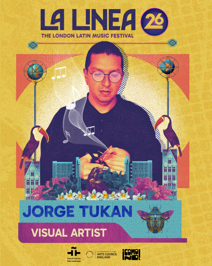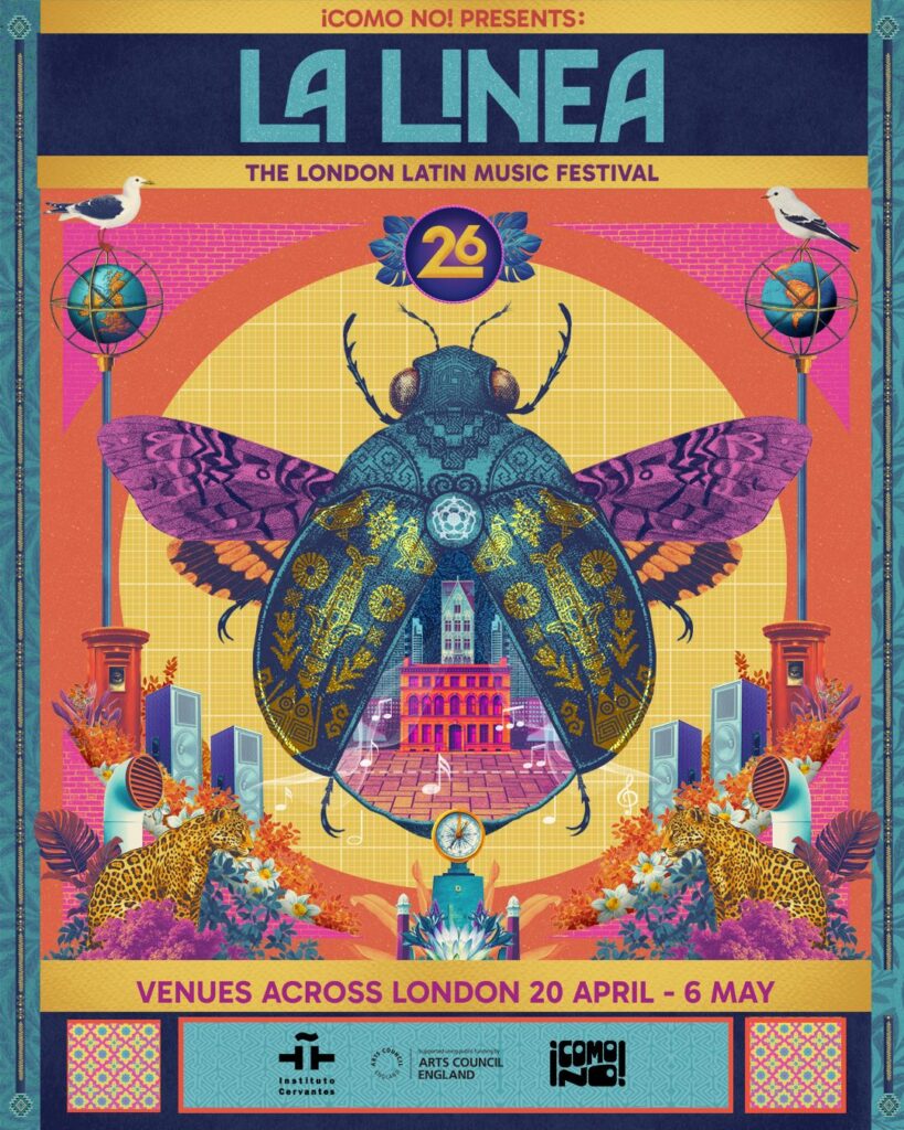 Between tropical flora, European architecture, and symbolic fauna, La Línea 26 proposes a collage that narrates the encounter between geographies, memories, and sounds. The beetle, as the central figure, becomes a bridge between worlds — an emblem of cultural vitality renewed through every crossing and every shared rhythm. More than a poster, this work is a visual metaphor of contemporary Latin American identity: diverse, hybrid, and in motion. La Linea 26 thus draws a living map of cultural connections, reaffirming the power of art as a space of encounter in the heart of London.